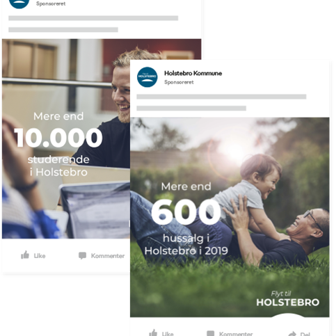 For at sikre kendskab og interesse blandt bosætningsmålgruppen blev der oprettet kampagner på Facebook og Instagram med målet om at få engagement og videovisninger samt skabe trafik til flyttilholstebro.dk.